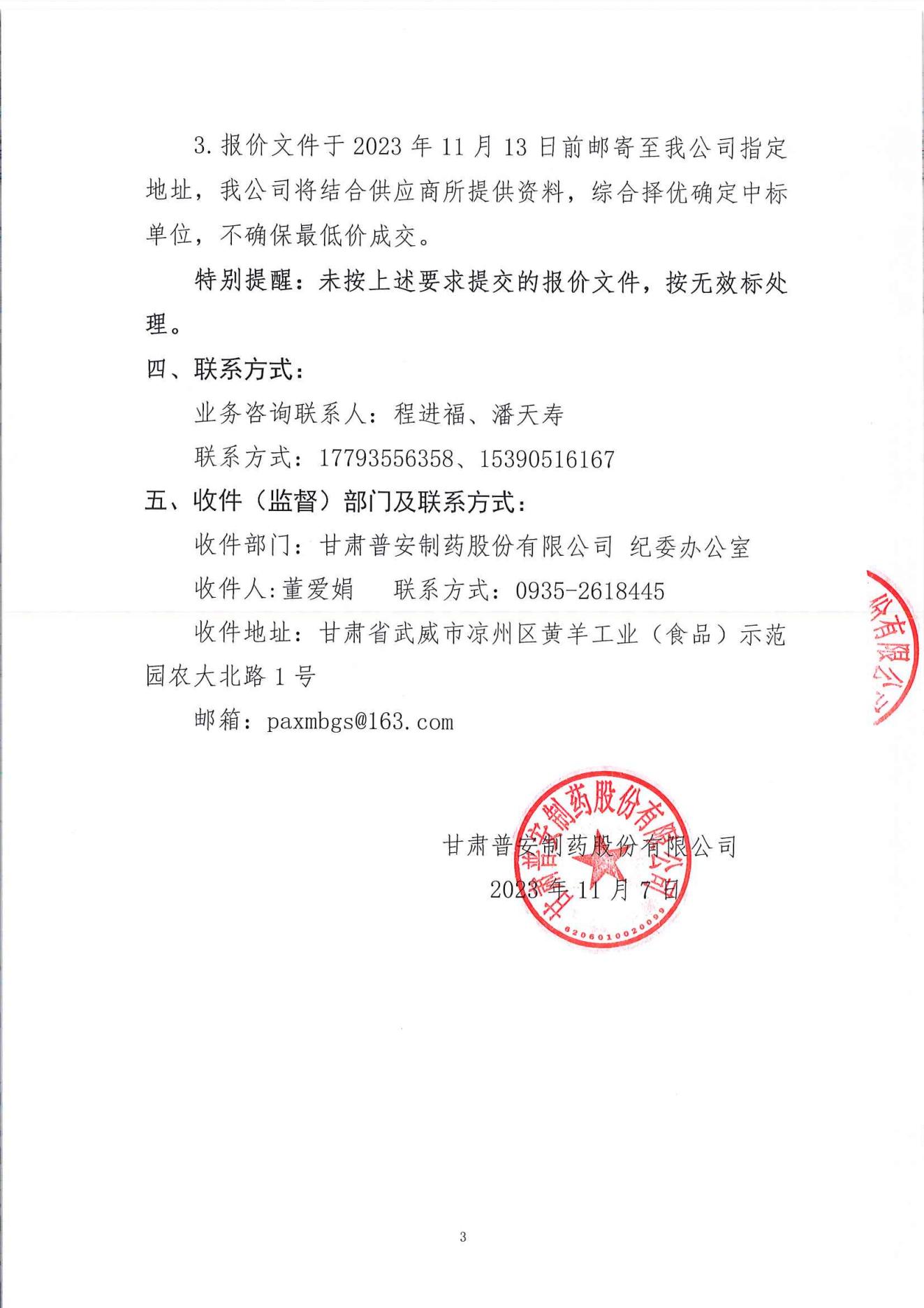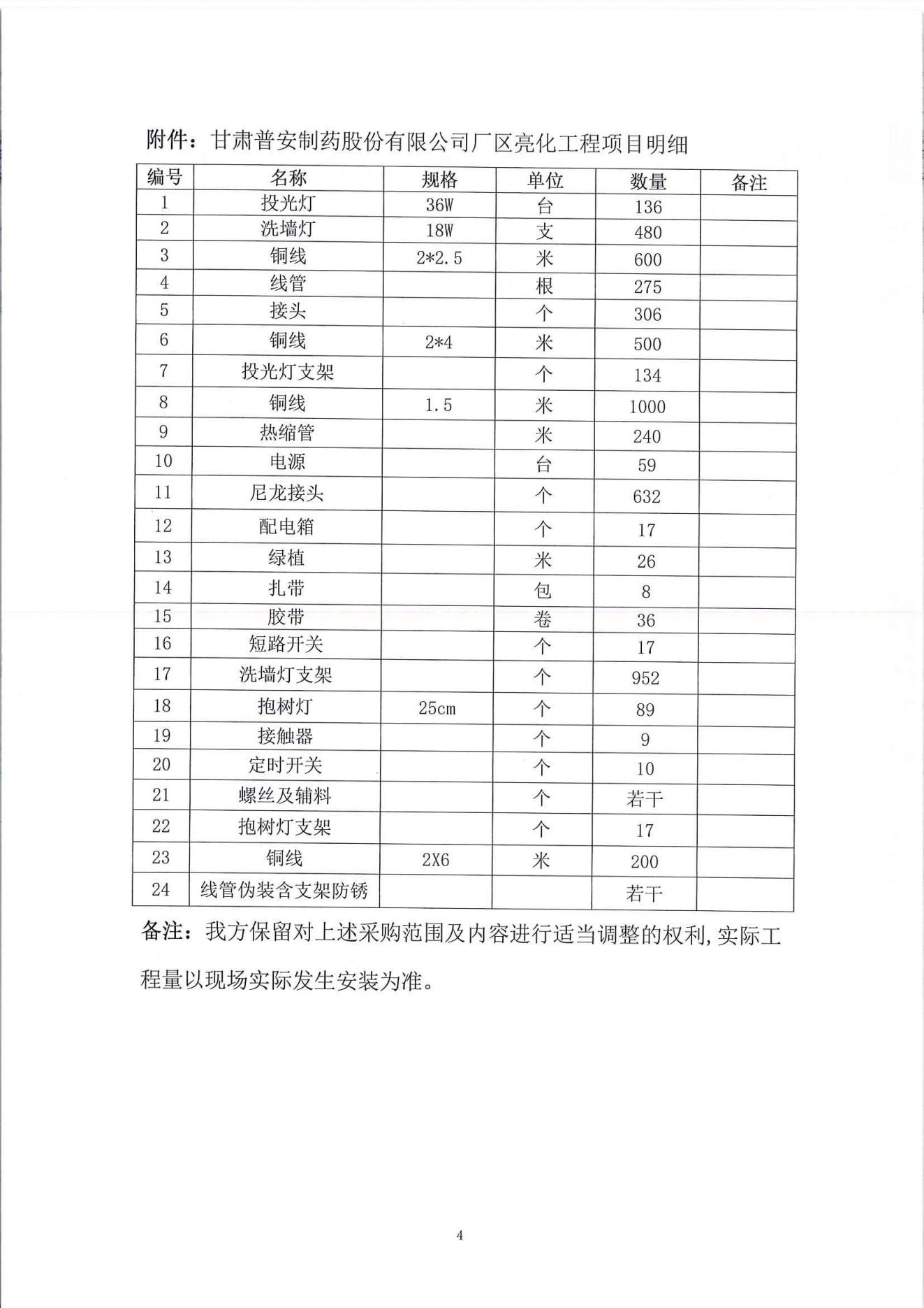 甘肅普安制藥股份有限公司廠區亮化工程項目詢價公告