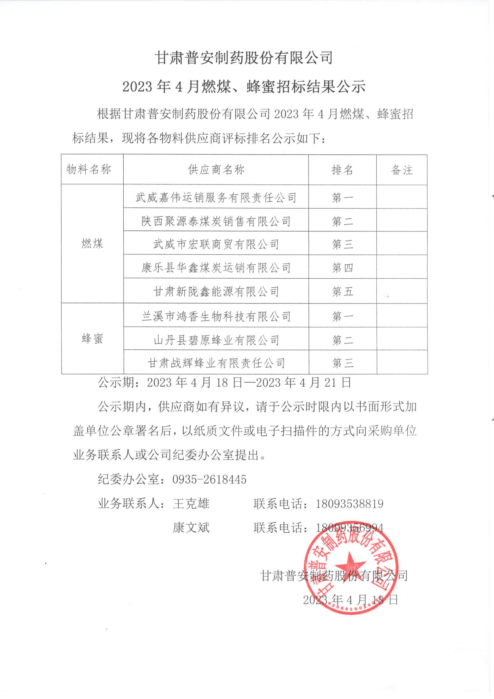 甘肅普安制藥股份有限公司2023年4月燃煤、蜂蜜招標結果公示