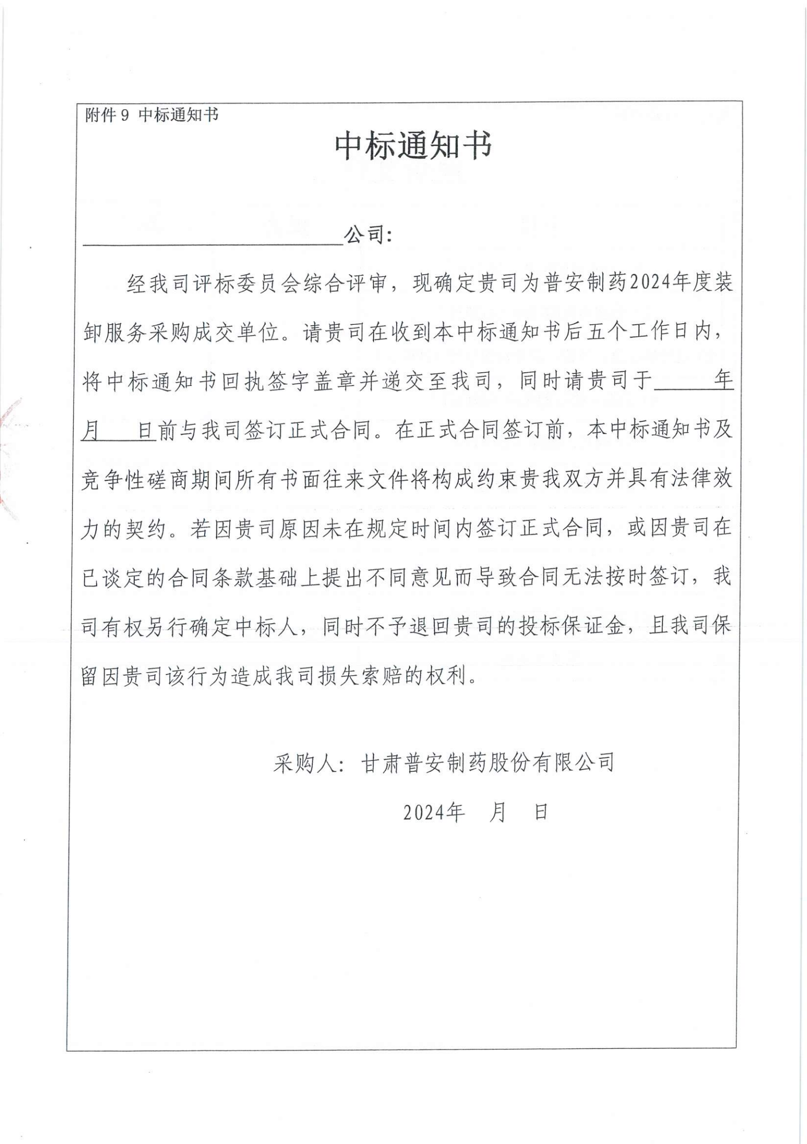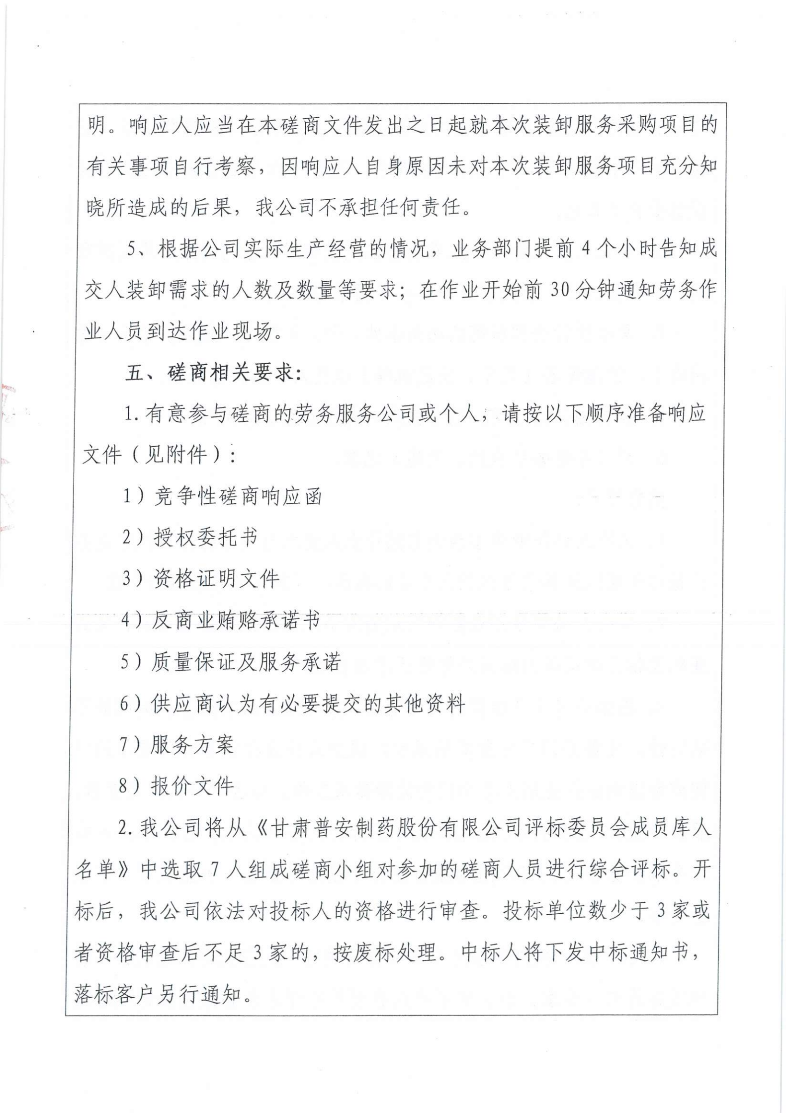 甘肅普安制藥股份有限公司裝卸服務競爭性磋商采購公告
