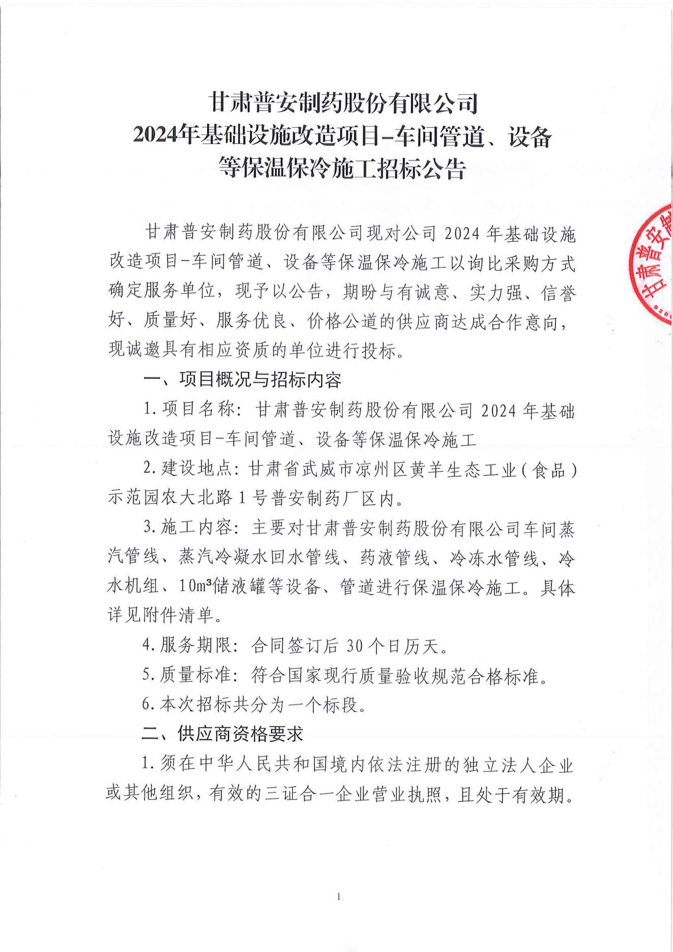 甘肅普安制藥股份有限公司2024年基礎設施改造項目-車間管道、設備等保溫保冷施工招標公告