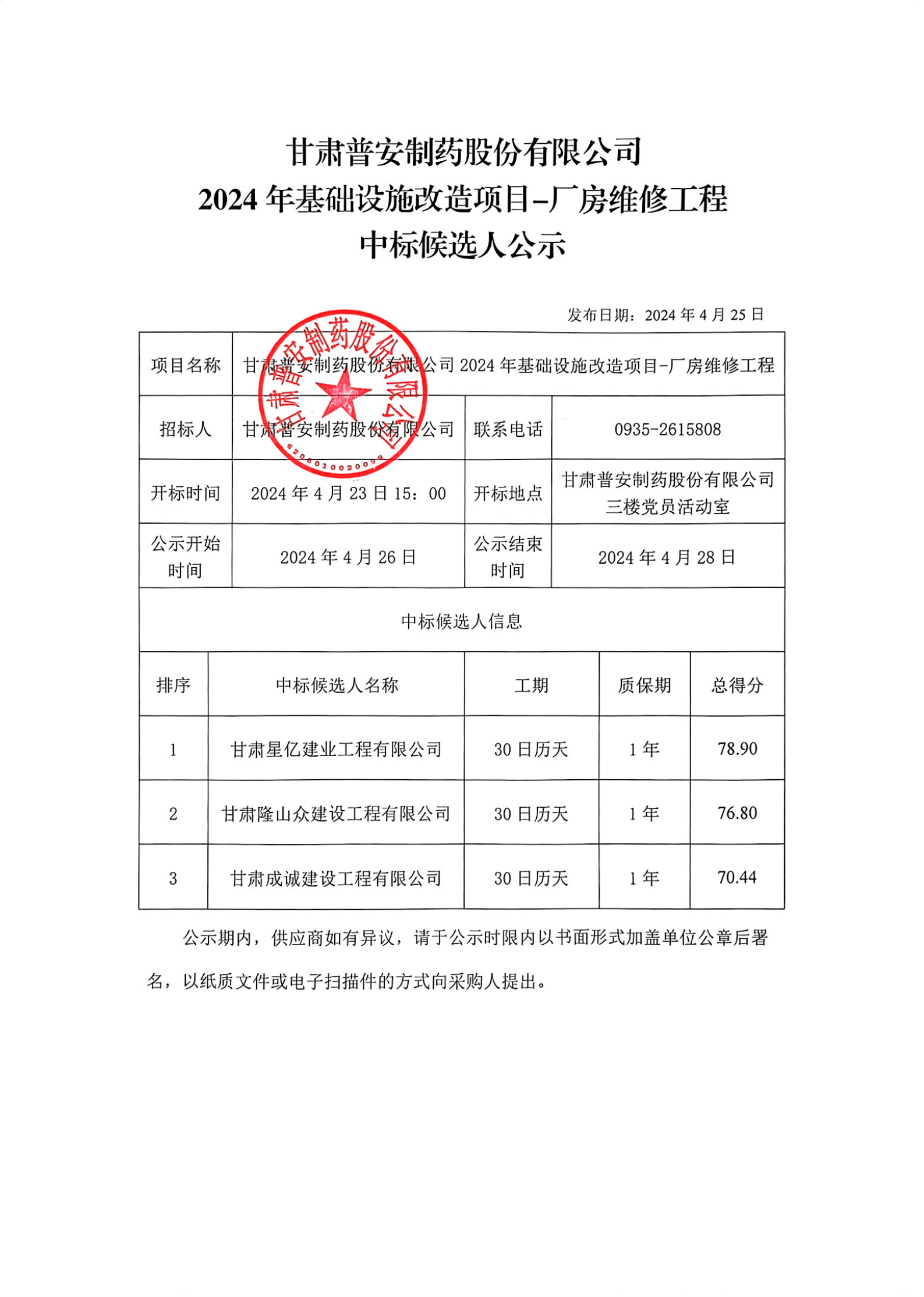 甘肅普安制藥股份有限公司2024年基礎設施改造項目-廠房維修工程中標候選人公示