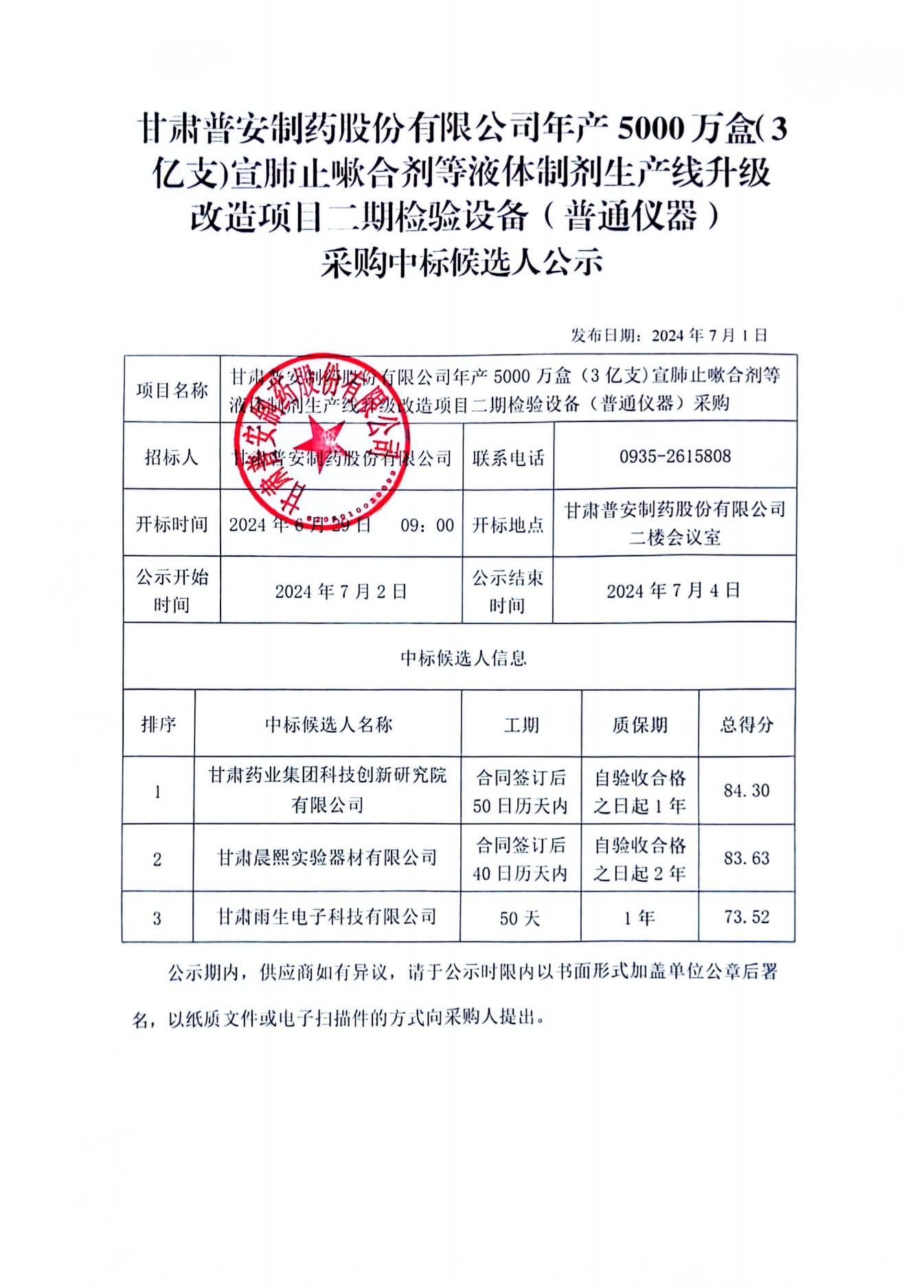 甘肅普安制藥股份有限公司年產(chǎn)5000萬盒(3億支)宣肺止嗽合劑等液體制劑生產(chǎn)線升級(jí)改造項(xiàng)目二期檢驗(yàn)設(shè)備(普通儀器)采購中標(biāo)候選人公示