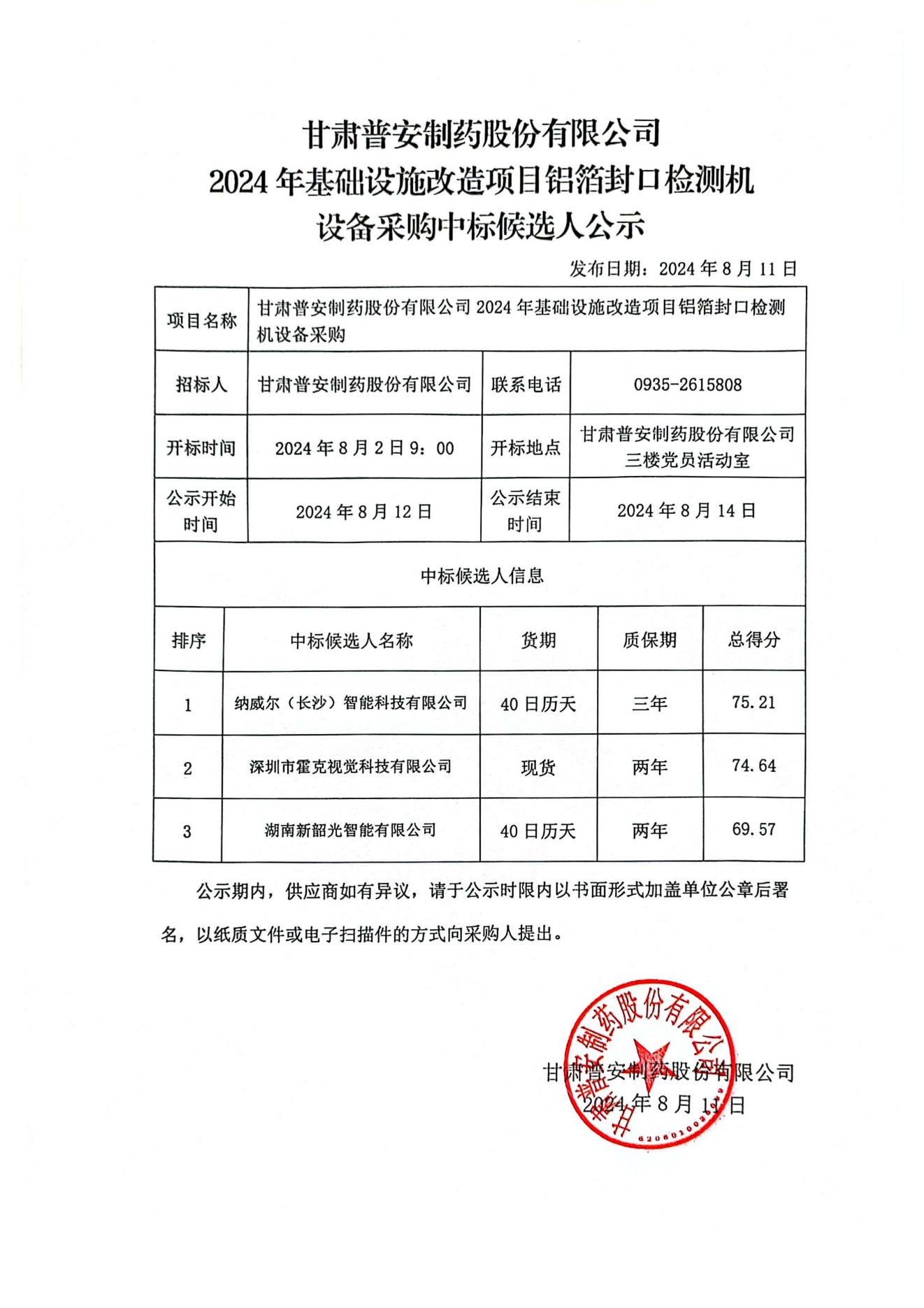 甘肅普安制藥股份有限公司2024年基礎設施改造項目鋁箔封口檢測機設備采購中標候選人公示