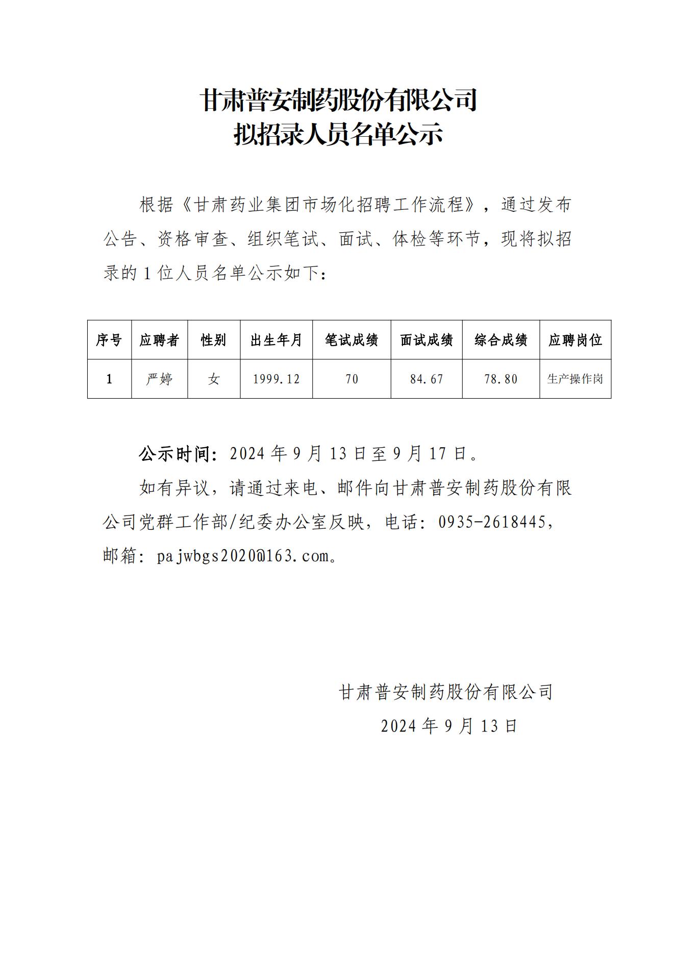甘肅普安制藥股份有限公司擬招錄人員名單公示
