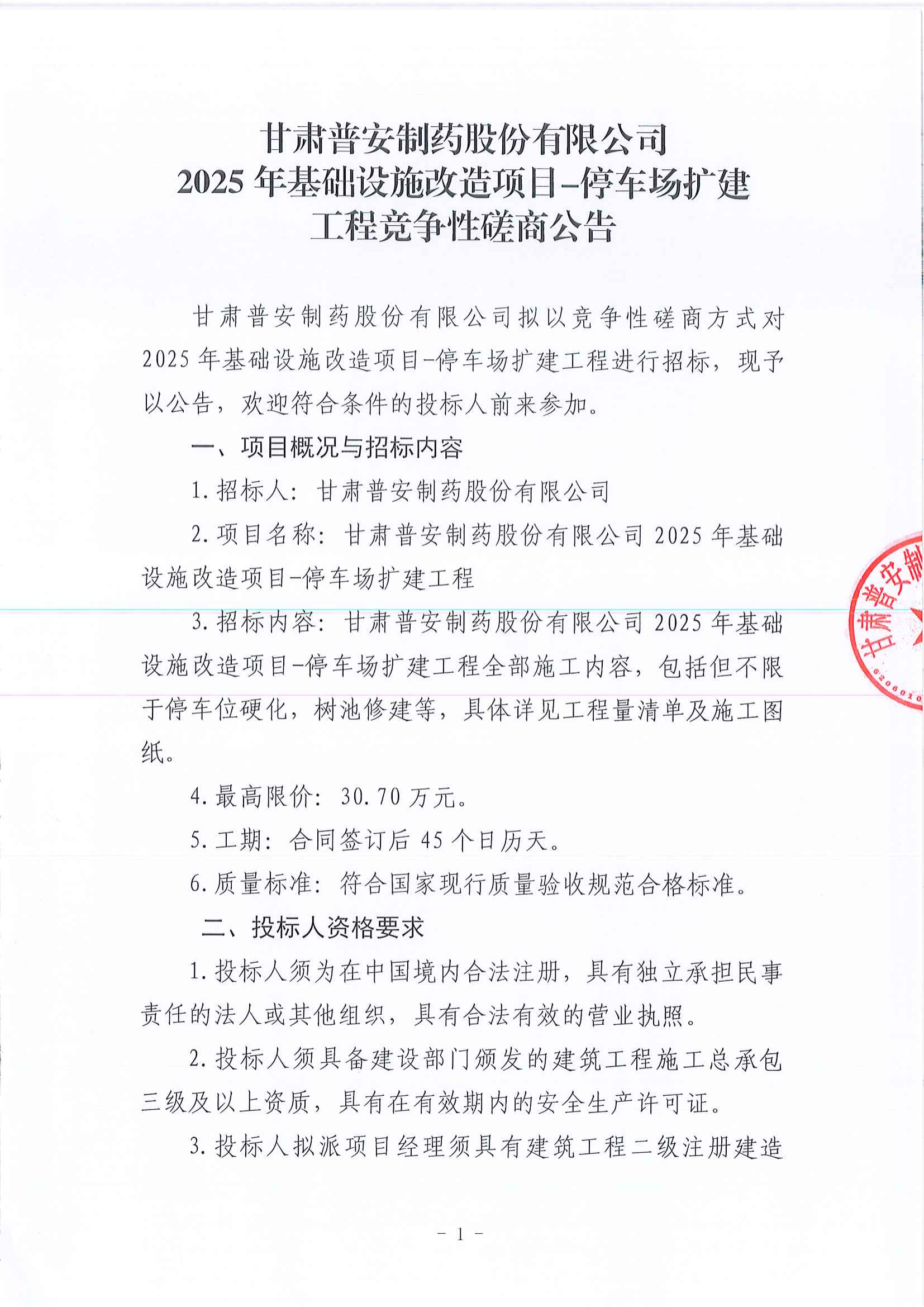 甘肅普安制藥股份有限公司2025年基礎設施改造項目——停車場擴建工程競爭性磋商公告
